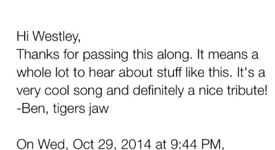#8 Nice Guy Thought: A few years ago I wrote a chorus for an alliswell song that went: “This is a song I wrote/trying to sound like Tigers Jaw[4]/These are the thoughts that I thought/While driving to work in my car/and they go ‘blah, blah, blah’.” Anyways, my friend Wes, later emailed Tigers Jaw a link to that song and they replied back (see pic below) very sweetly. They seem like nice, kindhearted people.